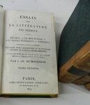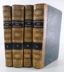 JUDAÏCA - MONTBRON (J. Ch. de). Essais sur la Littérature des Hébreux. Paris, Janet, 1819. 3 parties en 4 vol. in-12 ½ veau ép., dos lisses ornés, p. de titre et de tom. noires, tr. citron.