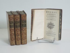 OEUVRES MORALES DE PLUTARQUE traduites en français par M. L'ABBE RICARD, PARIS, VEUVE DESSAINT 1785. 4 tomes in 12, 471, xvj, 532, 496, 498 p. PLEIN VEAU MOUCHETE, TITRE ET TOMAISON SUR PIECE, DOS ORNE. UN MORS LEGEREMENT FENDU. RELIURE AUX ARMES DE...
