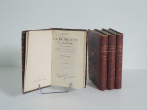 HISTOIRE DE LA CONQUETE DE L'ANGLETERRE PAR LES NORMANDS, de ses causes et de ses suites… en ECOSSE, EN IRLANDE ET SUR LE CONTINENT par AUGUTIN THIERRY, PARIS 1883. 4 VOL IN 12, 423, 374, 363, 339 p. DEMI CHAG, TITRE OR.