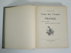 TENUE DES TROUPES DE FRANCE A TOUTES LES EPOQUES, ARMEES DE TERRE ET DE MER, PARIS, sd. AQUARELLES DE JOB. In folio, 104 p, 48 aquarelles avec serpentes en papier cristal et légende CARTONNAGE EDITEUR, TRANCHE OR ,TITRE SUR PLAT. COINS EMOUSSES.