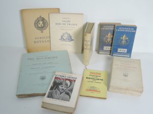 ROYAUTE : ENSEMBLE DE 9 LIVRES BROCHES SUR LE SUJET. GENEALOGIE DES BOURBONS, HISTOIRE DES FIEFS, TABLEAUX SYNOPTIQUES par HENRI LEHEC, PARIS 1881. PAROLES ROYALES 1933, FRONTISPICE DE DECARIS. CEREMONIAL DU SACRE DES ROIS DE FRANCE, 1931. Nombreuses...