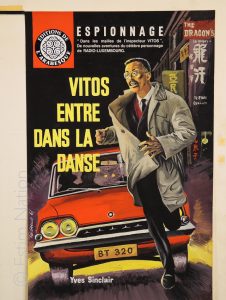 Couverture originale du roman d'espionnage de Yves Sinclair : " Vitos entre dans la danse" - Editions de l'Arabesque - n° 206 - 1er trim. 1962 - gouache couleur - avec montage par collage du titre/logo - signée par le peintre - 25,5 x 39,8 cm - collée sur carton fort