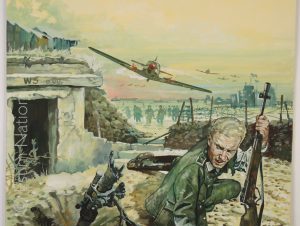 Couverture originale du roman de guerre de E. VON KLAPPER: " W5 n'existe plus - 5,6 juin 1944 " - Editions de l'Arabesque/Collection Baroud - 1966 - gouache couleur - signée par le peintre - 34,7 x 40 cm - sur carton fort. mentions au dos. Calque de mise en couleur.