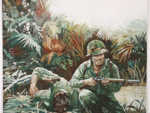 Couverture originale du roman de guerre de Paul Tomechs: " La mort verte - Nouvelle Guinée 1942 "- Editions de l'Arabesque/Collection Baroud - 1967 - gouache couleur - signée par le peintre - 34,6 x 40 cm - sur carton fort. mentions au dos