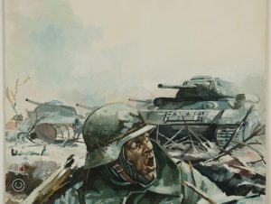 Couverture originale du roman de guerre de Georges Heil: " Les panzers attaquent - Front de l'est 1943 " - Editions de l'Arabesque/Collection Baroud - 1967 - gouache couleur - signée par le peintre - 34,5 x 40,3 cm - sur carton fort. mentions au dos
