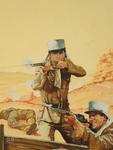 Couverture originale inédite prévue pour un roman de guerre non-paru d'un auteur inconnu à ce jour, aux Editions de l'Arabesque/Collection Baroud - circa 1965 - gouache couleur - signée par le peintre - 30,5 x 39,7 cm - sur carton fort. sans mentions au dos. Source: Catalogue raisonné de juin 2010 de Fantasia E.N. Editions, page 302.