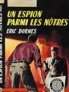 Couverture originale du roman d'espionnage de Eric Dornes ( R.Bonnet): "Un espion parmi les nôtres" - Editions de l'Arabesque - n° 192 -3ème trim. 1961 - gouache couleur - signée par le peintre - 29,5 x 39,9 cm - sur carton fort - avec le logo collé - mentions au dos