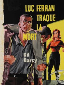 Couverture originale du roman d'espionnage de la série "Luc Ferran" de Gil DARCY (Noble) : "Luc Ferran traque la mort"- Editions de l'Arabesque - n° 270 - 2ème trim. 1963 - gouache couleur - signée par le peintre - 29,5 x 40 cm - sur carton fort - sans bandeaux - tampon du dessinateur au dos