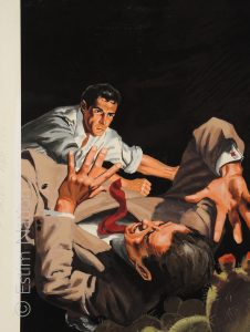 Couverture originale du roman d'espionnage de Jack Jérôme (Gilliot): "A bride abattue" - Editions de l'Arabesque - n° 419 - 4ème trim. 1965 - gouache couleur - signée par le peintre - 29,5 x 41,2 cm - sur carton fort - tampon du studio de l'artiste au dos - pas de titre