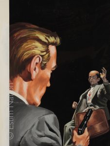 Couverture originale du roman d'espionnage de Jean Laune (Noble): "Mission appat" - Editions de l'Arabesque - n° 442 - 1er trim. 1966 - gouache couleur - signée par le peintre - 29,5 x 41,2 cm - sur carton fort - tampon du studio de l'artiste au dos - pas de titre