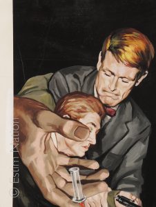 Couverture originale du roman d'espionnage de la série "Luc Ferran" de Gil DARCY (Bernierl) : "Luc Ferran - S.O.S. pour I.D. 18"- Editions de l'Arabesque - n° 470 - 4ème trim. 1966 - gouache couleur - signée par le peintre - 29,5 x 41,3 cm - sur carton fort - sans bandeaux ni titres - tampon du dessinateur au dos