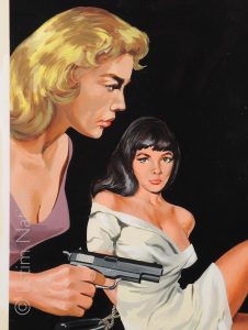 Couverture originale du roman d'espionnage de la série "Luc Ferran" de Gil DARCY (Buré) : "Luc Ferran se rebiffe"- Editions de l'Arabesque - n° 380 - avril 1965 - gouache couleur - signée par le peintre - 29,5 x 41,3 cm - sur carton fort - sans bandeaux ni titres - tampon du dessinateur au dos