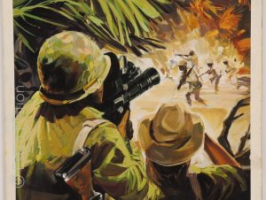 Série "BAROUD" - Couverture originale du roman de guerre de Jean-Michel Sorel : "Terreur au Biafra - Biafra 1968 " - Editions de l'Arabesque - n° 37 - 1er trim.1969 - gouache couleur - non-signée par le peintre - 25 x 30,2 cm - collée sur carton fort.