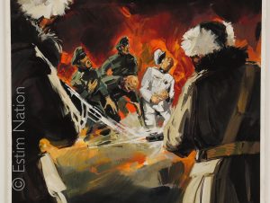 Série "BAROUD" - Couverture originale du roman de guerre de R.V. Karanoff (Vaudois) - "Groupe d'assaut IV - Allemagne 1945"- Editions de l'Arabesque - n° 50 - 4ème trim. 1969 - gouache couleur - non-signée par le peintre - 23,7 x 29,5 cm - collée sur carton fort.