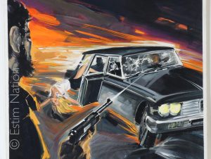 Couverture originale du roman d'espionnage de H.T. Perkins (Trémésaigues ?) : " La peau de l'artiste "- Editions de l'Arabesque - n° 608 - 4ème trim. 1969 - gouache couleur - non-signée par le peintre - 24,2 x 29,6 cm - sur carton fort, sans titres - image inversée sur la couverture de l'édition du roman