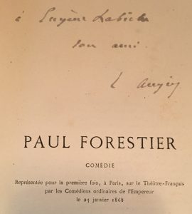 Éditions originales, avec envois autographes à Labiche, sur le faux-titre : « à Eugène Labiche son ami E. Augier », et sur la page de garde : « à Eugène Labiche son ami et collaborateur E. Augier ».