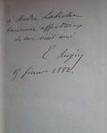 On joint son Théâtre complet (Paris, Calmann Lévy, 1881) ; 6 vol. in-12, demi-reliure de l’époque chagrin bleu, dos ornés, têtes dorées. Édition collective, avec envoi autographe en tête du 1er volume : « à André Labiche souvenir affectueux de son vieil ami E. Augier 15 février 1882 ».