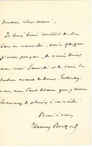 Je n’ai ni la force ni le goût de l’écrire. [...] J’ai toujours résisté à la tentation et vous savez si elle est grande pour un auteur, de parler de moi, de défendre mes ouvrages, de les appuyer sur des théories qui m’intéressent mais sans me convaincre »... – Il se réjouit de la bonne nouvelle que son amie lui a annoncée : « Voici ce que je vous propose, de venir dîner avec moi samedi et de faire la lecture avant le dîner. Entendez-vous avec Paul Adam que j’aurais beaucoup de plaisir à connaître »... – « Je ne sais plus pourquoi ma comédie L’Enlèvement figure parmi mes autres ouvrages. Elle n’a jamais été imprimée, ce n’est pas assez de dire qu’elle m’appartient, elle n’existe plus »...