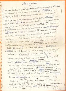 suite manque). Le manuscrit présente des ratures et corrections. « Il arrive, par le privilège théâtral, ce paradoxe que l’Histoire qui se déforme à la longue et que le mythe qui, à la longue, se fortifie, trouvent leur véritable réalité sur les planches ». C’est au dramaturge de provoquer l’hypnose collective et de « faire partager son rêve – car le sommeil et le songe mettent une sorte de génie à la portée de toutes les bourses » Le public doit être disponible comme celui des marionnettes et devrait avoir envie « de crier par exemple, à Œdipe : “n’épouse pas Jocaste, c’est ta mère !” ». Il arrive « qu’un bloc de spectateurs de désindividualise au bénéfice d’une pensée étrangère qu’il adopte et avec laquelle il collabore »... On joint : un tapuscrit, L’Histoire des Parents terribles ; un manifeste en fac-similé par Georges Auric, Jean Cocteau et Steve Passeur (1945) ; plus le fac-similé d’un message de Cocteau (1962) ; un numéro de FIA Nouvelles (1980) avec vignette de Cocteau.