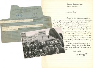 On joint 1 télégramme de Paul Éluard envoyé chez lui, juillet 1947 ; et une photographie du poète en Italie au milieu d’ouvriers (1947 ?).
