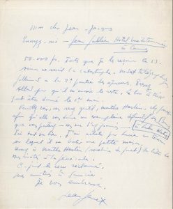 [celle-ci fut créée à l’Athénée le 19 avril 1947]. Paris 27 janvier 1947. Cession de Haute surveillance (titre ajouté à la main) à 60 exemplaires hors commerce. « La propriété cédée est celle de la copie dactylographiée de cette pièce […] Pour cet abandon de droits, je recevrai 130.000 fr. dont 30 (trente) à remise du manuscrit, et 100 (cent), le 15 mars 1947 »… [Cannes fin mars 1947]. « Voulez-vous avoir la gentillesse de m’envoyer le plus tôt possible recommandé la version de Haute surveillance corrigée par Barrault. Faites aussi que les 50.000 fr. m’arrivent pour le 13. Envoyez un mandat télégraphique au nom de Jean Gallien Hôtel Méditerrannée Cannes. Je sais que je vous dois 5.000 fr. Mais je serais content si vous les reteniez à la fin, sur le dernier versement »… [Cannes 31 mars 1947]. « Soyez gentil de me faire parvenir la dactylographie de Haute surveillance, celle qui est corrigée par Barrault. […] Dites-moi si vos rapports avec Gallimard sont aussi cordiaux »… Il donne les coordonnées à Cannes de Mme Maglia, avec qui Pauvert devra traiter « pour nos prochaines affaires »… [Cannes 7 avril 1947]. « Envoyez-moi – Jean Gallien Hôtel Méditerranée à Cannes 50.000 fr. Faites que je les reçoive le 13. Sinon ce serait la catastrophe. Mandat télégraphique. Gallimard a la 2e partie des épreuves. Pressez Allard pour qu’il m’envoie le reste. Le bon à tirer peut être donné le 1er mai. Veuillez voir, vous serez gentil, Marthe Herlin, chez Jouvet afin qu’elle vous donne un exemplaire définitif des Bonnes que vous porterez – vous me l’avez promis – à Lulu Watier. Ici tout va bien. J’ai acheté pour Lucien un terrain sur lequel il va bâtir une petite maison »… Il faut aussi donner à Marthe Herlin la liste des invités à la générale… Deux reçus : Paris 12 mars [1947 (déchiré)]. « Je reconnais avoir reçu de Monsieur Jean-Jacques Pauver la somme de quatre vingt mille francs représentant une créance sur les 130.000 frs qui sont le prix auquel je lui ai cédé le droit d’éditer Haute surveillance »… Paris 15 mars 1947. Reçu pour la somme de 130 000 fr, « représentant mes droits d’auteur pour une édition de ma pièce Haute surveillance, édition destinée aux Cinéastes Bibliophiles »… On joint la copie carbone d’une lettre de Pauvert à Genet, Sceaux 26 janvier 1947, confirmant les termes de la cession de Haute surveillance.
