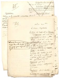 comédie-vaudeville en un acte par Labiche, Auguste Lefranc (1814-1878) et Eugène Nyon (1812-1870), créée au Théâtre du Palais-Royal le 17 juin 1846, par Sainville (le Prince de Piombino), Ravel (le perruquier Formoso), Rousset (Tagliarini, maître du palais et agent secret du Prince), et Mmes Lambert (la Duchesse de Norino, favorite du Prince) et Aline Duval (Floretta, fiancée de Formoso) ; publiée à l’époque par Michel Lévy [OC, t. I p. 263]. La poudre en question est destinée à masquer la couleur des cheveux de la Duchesse, dont la fausse chevelure brune se décolore... * Manuscrit autographe de la fin de la pièce dans une première version, paginée 36-44 (9 pages in-fol.), avec les scènes 18 à 22 ; le perruquier s’y nomme Portugalini. Le manuscrit, de la main de Labiche, présente de nombreuses ratures et corrections, certaines de la main de Lefranc. * Manuscrit de copiste en partie autographe, entièrement corrigé et remanié par Labiche ([1]-68 pages in-4, qqs déchirures). Sur la liste des personnages, le lieu de l’action (et le nom du Prince) est changé de de Bénévent en Piombino. Le manuscrit est abondamment raturé et surchargé de corrections et additions marginales ; les pages 36-44 et 60-68 sont entièrement autographes et ont été insérées dans la copie, repaginée ensuite. * Manuscrit de copiste, corrigé par Labiche et ses collaborateurs (cahier de 50 pages in-4, couverture verte) ; mise au net du manuscrit précédent, avec de nouvelles corrections et additions par Labiche et Lefranc ; la fin manque (plus 6 ff. écartés). * Manuscrit en partie autographe ([1]-62 pages in-4), à partir d’une copie du manuscrit précédent, portant de nombreuses corrections et additions par Lefranc et Nyon sur les 25 premiers feuillets ; les feuillets 26 à 34 sont entièrement de la main de Labiche ; la fin (ff. 35-36) est rédigée par Nyon. Le perruquier se nomme toujours Portugalini. * Brouillons en partie autographes pour la version finale (46 ff. petit in-4) ; le perruquier se nomme maintenant Formoso. 24 pages sont entièrement de la main de Labiche ; les autres feuillets sont de la main de Nyon ou de Lefranc, qui a notamment rédigé les textes des couplets.