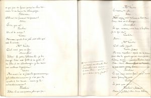 août 1855, par Grassot (le musicien Carolus de Valtravers), Luguet (le poète Vertchoisi), Brasseur (le peintre Ulric), Amant (le bourgeois Gaudin), Pellerin (le maître de forges Dumoufard), Octave (le domestique Fulbert), Mme Thierret (Mme Gaudin), Mme Irma (Delphine, nièce de Gaudin) et Marie Dupuis (la couturière Olympe) ; publié par Michel Lévy [OC, t IV, p. 103]. Manuscrit de copiste d’une première version, probablement par Auguste Lefranc (son nom est noté au crayon sur la couverture), en 11 scènes (la pièce en comptera 18), très différente de la version finale, annoté et corrigé par les deux collaborateurs, avec des passages biffés par Labiche, qui a ajouté de sa main une réplique dans la marge de la dernière scène.