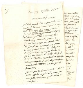 Eugène LABICHE. L.A. (minute inachevée), Souvigny 5 juillet 1865, à son « cher défendeur » ; 4 pages et demie petit in-4. Brouillon de lettre à son avocat. Il est immobilisé par un accident : « Je me suis rompu un muscle de la jambe en...