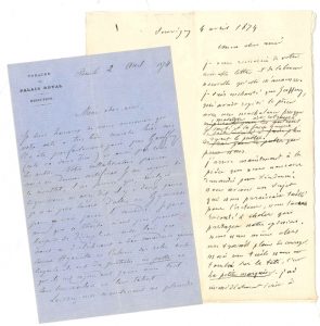 l’acteur Geoffroy [dans La Pièce de Chambertin]. Il s’inquiète de ce que sa nouvelle pièce promise avec Duru [Les Samedis de Madame ?], écrite pour Dieudonné, avec « un sujet qui nous paraissait taillé pour l’acteur », présente des similitudes avec La Petite Marquise (de Meilhac et Halévy donnée au théâtre des Variétés). Il va donc « très honnêtement, très consciencieusement tâcher de trouver un remède au mal. [...] Songez qu’il n’est ni de l’intérêt du théâtre, ni de celui du débutant, ni du nôtre d’arriver avec une pièce moisie »... On joint la L.A.S. de Léon Dormeuil du 2 avril 1874 (3 pages in-8, à l’en-tête du Théâtre du Palais-Royal), qui informe Labiche du succès de Geoffroy ; il s’inquiète du peu de cordialité de Labiche, et de ses reproches, en donnant le détail des succès de l’année passée. Plus une L.A.S. de Geoffroy à Labiche le priant de lui prêter de l’argent ; et une L.A.S. du baron Lucien Corvisart, Chislehurst 20 mai 188, au nom du Prince Impérial, remerciant Labiche de l’envoi de son Théâtre complet.
