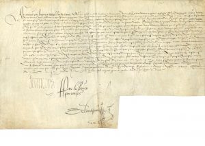 Ordre à son receveur général des finances extraordinaires Jehan LAGUETTE de payer comptant à son conseiller et maître des requêtes ordinaires Nicolas DANGU, Évêque de Sées, une somme de quinze mille livres tournois, pour le remboursement de la somme que Dangu lui avait prêtée « pour subvenir a lurgente necessité des affaires que nous avons a supporter pour le faict de la guerre »…