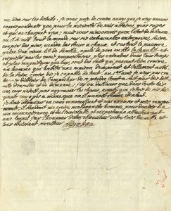 Il est fâché de l’embarras que cause son fils à M. de Gassaud... « il n’alloit pas a penser qu’on ne put trouver un gite quelconque dabord et je ne le voulois pas bon ; car enfin Monsieur ou il faut desesperer a jamais de cette tête là, ou sans le perdre, et ménageant au contraire touts les moyens de le sauver il faut la fraper par les effets amplement mérités de la sévérité publique et privée et faire révolution dans ce moulin a vent d’orgueil. Dans ce plan là Monsieur l’inébranlable tendresse et la douce participation a ses malheurs prétendus, mais très réels pour sa respectable femme, votre compagnie et la sage participation que vous voulez bien prendre a son sort, sont des émolliants qui pourront, si dieu le veut, fondre son cœur et ramener sa tête ». Il espère obtenir pour son fils un logement au baillage du château, et parle du « dédale immense de la vérification et liquidation des dettes de cet insensé [...] vous m’avouerez qu’en létat de défiance ou il a mis tout le monde sur ses extravantes entreprises, faire couper des pins, vendre des fours a chaux et surtout le pauvre galon dun vieux lit de famille, apelé de père en fils le beau lit [...] sont des faits qui peuvent faire croire un homme qui habite une maison d’emprunt [...] capable de tout. Au 1er avis je n’ay pas cru devoir différer de l’empêcher de se perdre tout a fait par des détails d’insulte et de démence »...