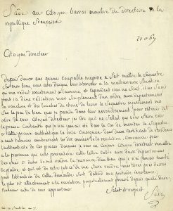 Le « Citoyen directeur » a daigné s’intéresser à la « malheureuse situation » de Sade, « depuis deux ans qu’une coupable méprise a fait mettre le sequestre sur mon bien » et qu’il est « réduit exactement à l’aumone » : « il ne s’agit point ici d’une radiation mais simplement d’un ordre aux departemens de Vaucluse et des bouches du Rhone de lever le sequestre injustement mis sur le peu de bien que je possede dans leur arrondissement » ; il apporte la preuve « que je n’ai jamais été dans le cas de meriter ce sequestre […] consignée dans deux certificats de residence a neuf temoins ambrassant les dix années de la revolution ». Il conjure Barras de donner l’ordre « de me rendre la jouissance d’un bien que je n’ai jamais mérité de perdre, et qu’il est de votre justice de me faire rendre ; mes titres près de vous pour l’obtention de cette demande sont, d’abord ma profonde innocence ; le plus vif attachement à la revolution, perpetuellement prouvé depuis qu’elle dure ; l’honneur enfin de vous appartenir ».