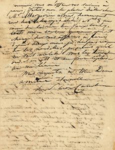 Cambronne se réjouit de la paternité de son correspondant, mais il désespère d’être employé : « je suis toujours en demande d’un traitement quelconque ; jusqu’à présent je n’ai pas réussi. Si j’acceptais du service, je me trouverais trop heureux de vous prendre au mot de nous revoir ensemble » ; mais « il faudrait que je sois plus avancé que je suis pour avoir l’espoir d’être ensemble ; vous savez que je ne veux pas un autre grade que celui que j’ai connu »…Il le charge de voir à Paris son cousin qui s’occupe de ses affaires et l’assure de son « amitié éternelle »…