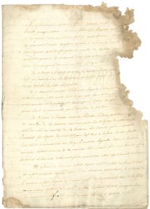 in-fol. (mauvais état, fortes mouillures ayant détruit un angle et une partie d’un bord).