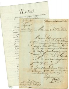 Plus un manuscrit de Notes pour servir au projet de l’arme du génie, un récépissé de payeur de la Guerre, l’envoi d’un certificat médical par un capitaine de grenadiers, la lettre d’un père de soldat qui n’a pas donné signe de vie depuis la retraite de Russie, etc.