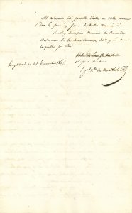 Protestation contre les conditions de détention de l’Empereur et de ses compagnons à Longwood. « Notre position à Longwood quelqu’affreuse qu’elle soit n’exciteroit de notre part aucune plainte, et nous saurions la supporter avec la résignation du martyr, si l’on ne manquoit continuellement aux égards dus à nos rangs et à notre malheur. Si à l’injustice qu’a commise votre gouvernement d’envoyer l’Empereur Napoléon à Ste Helene, au mépris de tous les droits des nations, et de l’indignation de tous les ages et de tous les peuples, on a ajouté celle de nous reléguer sur le point de l’isle le plus sauvage, du moins devions nous esperer que nous y trouverions les consolations dont vos ministres même n’avoient osé nous priver, et cependant chaque jour on restreint davantage des communications avec les habitans »… Contrairement aux instructions antérieures, le Dr O’MEARA n’est plus autorisé à les accompagner en dehors de l’enceinte, des visiteurs sont refusés à la grille de Longwood, et l’enceinte n’offre aucune promenade agréable… L’Empereur souffre de l’odeur de la peinture à l’huile et sa santé s’altère dans ce climat désagréable… Les meubles et le linge manquent, et les marchands de Jamestown refusent de leur en vendre… Ils n’ont pas de fusils de chasse, suivant le refus donné au général GOURGAUD… Montholon dresse une liste de réclamations concernant leurs sorties et leurs visites, les déplacements du maître d’hôtel et le règlement précis, et demande enfin qu’ils puissent s’établir l’hiver « dans la partie de l’isle où il y a de la verdure, des sites moins affreux et une température plus agréable et saine »… Provenance  Archives du général BERTRAND (2 avril 2007, n° 29.