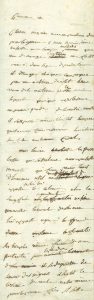 Écrit à l’encre brune sur un petit feuillet de papier vergé bleuté étroit, correspondant probablement à une colonne d’un feuillet plié en deux comme le restant du manuscrit, il donne le texte le plus élaboré du début, dont existent trois autres ébauches ; il présente cependant quelques ratures et corrections.
