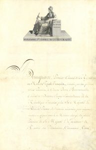 MARET ; 2 pages d’un bifeuillet de vélin in-fol., dans une superbe calligraphie avec lettrine, grande VIGNETTE gravée de Bonaparte 1er Consul de la République, sceau sous papier.