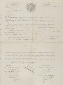 1 page grand in-fol. en partie imprimée, VIGNETTE aux armes impériales, en-tête Napoléon, Empereur des Français, Roi d’Italie, Protecteur de la Confédération du Rhin, Médiateur de la Confédération Suisse, &c. &c., cachet sec.