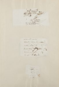 NAPOLÉON Ier (1769-1821) Empereur. DESSINS originaux et NOTES autographes ; 3 fragments (dont 2 recto-verso) découpés dans un feuillet de papier vergé (filigrané Budgen & Wilmott), postérieurement montés à fenêtre sur un feuillet...