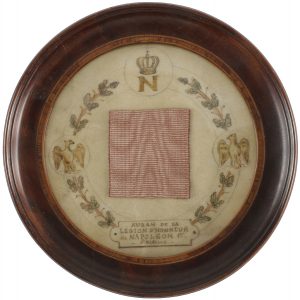 [NAPOLÉON Ier (1769-1821)]. Morceau de ruban de la Légion d’Honneur ; 3,5 x 3,3 cm collé sur un médaillon (diamètre 8,5 cm) de parchemin peint d’une couronne de branches de chêne agrémentée de deux aigles impériales et du N...