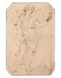 Pierre-Paul RUBENS Siegen, 1577 - Anvers, 1640. Ange debout tenant une lance et les clous de la croix. Plume et encre brune sur trait de crayon, les angles coupés.