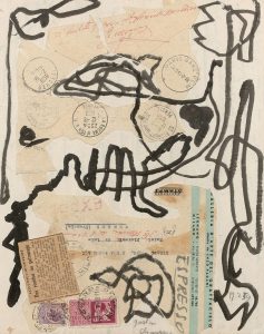 Gaston CHAISSAC 1910 - 1964. Composition -1959. Feutre noir et collage d'enveloppes cachetées sur papier monté sur panneau. Signé au crayon en bas au centre « Gaston Chaissac », daté au crayon en bas à droite « 19.2.59 », annotations...