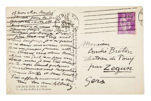 Carte postale autographe signée à André Breton qui est en vacances au château de Pouy, demeure de Valentine et Roland Penrose. Giacometti ne va pas bien : « je ne suis presque jamais sorti, vu Éluard une demie-heure et hier soir Péret. » Il demande des nouvelles de Breton et de leurs amis communs : « Comment vont Jacqueline, Marie-Berthe et Max Ernst ? »