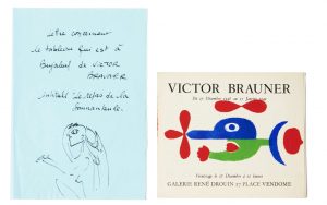 VICTOR BRAUNER (1903-1966). Réunion de 2 lettres autographes signées à Henriette Gomès, 1 dessin à l'encre et 1 dépliant avec un pochoir en couleur. Les Celliers de Rousset et [s.l], [vers 1942-1943] et 17 juin 1943. 2 p. sur 1 f. et 1 double...