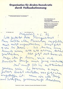 BEUYS JOSEPH (1921-1986). L.A.S. «Joseph Beuys», Düsseldorf 1er juin 1972, à Alois HENGARTNER, à Saint-Gall (Suisse) ; 1 page et demie in-4 à en-tête Organisation für direkte Demokratie durch Volksabstimmung, enveloppe avec contreseing ;...