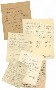 Villa du Bosquet, Le Cannet. «Voulez-vous me faire un sous-verre pour mon dessin destiné à l'orphelinat. J'écris à Mme Lefèvre qui viendra le chercher»... Villa du Bosquet, Le Cannet. «Mr CArré va vous remettre une gouache et 2 grands dessins. L'un de ces dessins représentant un chat est à demi effacé, vous me le garderez»... Villa du Plein Air, Deauville. Commande de sept châssis, avec mesures... - «Je vous envoie un dessin à mettre sous verre avec marge. C'est pour la tombola Gasquet chez Druet»... - «Veuillez confier à MM. Bernheim Jne le tableau qui vient du Salon d'Automne de l'année dernière»... - «Ci-joint un chèque de 1760f»...
