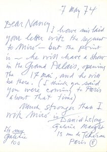 si Nancy écrit à Daniel, et lui dit ce que Calder fait pour elle et ce qu'elle voudrait que Miró fasse pour elle - Daniel est très gentil et pourrait le suggérer à Miró, alors que lui-même pourrait faire une gaffe...