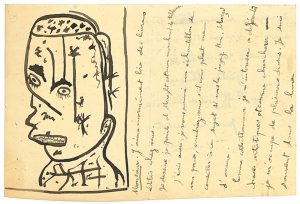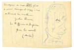 Dessin original en tête de la lettre, puissante tête d'homme à l'encre noire (environ 13 x 8 cm).