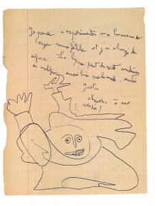 Le dessin à la fin de la lettre, occupant la moitié inférieure de la page (environ 13,5 x 15 cm) représente un bonhomme les bras levés qui semble s'envoler.